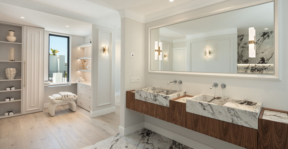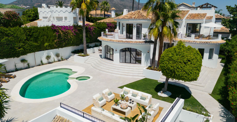 This chic villa boasts a unique architectural design with a central dome-like structure, classic white walls, and traditional Andalusian roof tiles. Outdoor terraces, perfect for dining and lounging, offer year-round enjoyment of Marbella's pleasant weather. Surrounded by lush greenery, the villa ensures privacy, and the distinctive pool and jacuzzi enhance visual appeal. Inside, refined décor and attention to detail, along with the circular motif, create an elegant atmosphere. The fully equipped kitchen features impeccable carpentry and a central island. The master bedroom, with direct terrace access, exudes elegance, and the bathroom showcases exquisite marble. Situated in Aloha, the villa provides breathtaking views of La Concha mountain and easy access to amenities in Nueva Andalucia's Golf Valley.